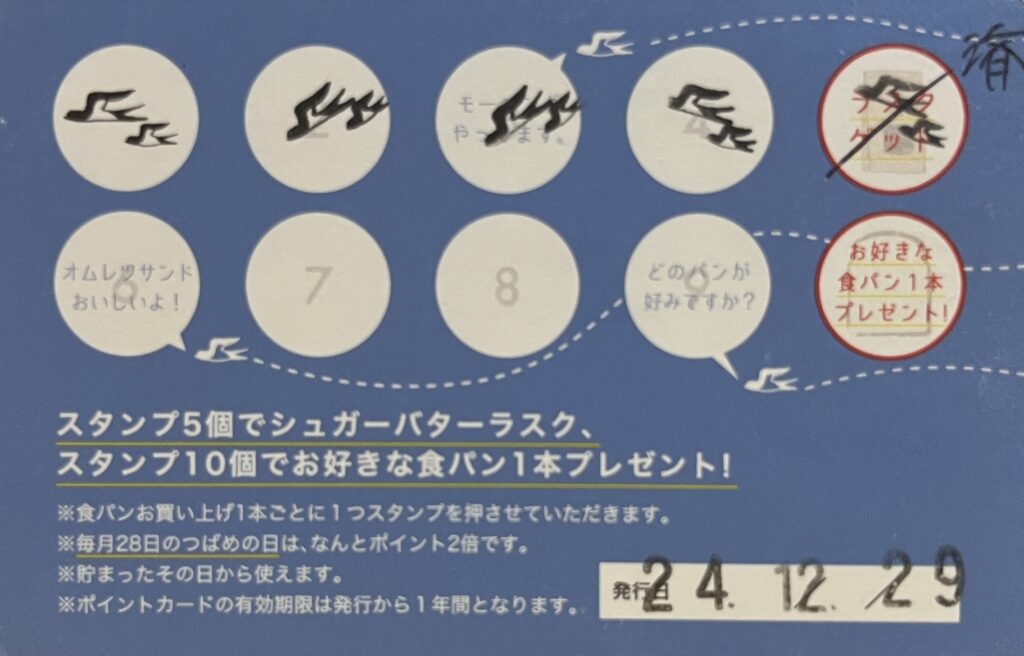 スタンプカードがあり、食パン1本購入ごとに1つ押してもらえます。スタンプを5個貯めるとシュガーバターラスク、10個で食パン1本もらえます。私はよく買いに行っているので、スタンプカードは2週目です笑(名古屋に住んでいないのに…笑)