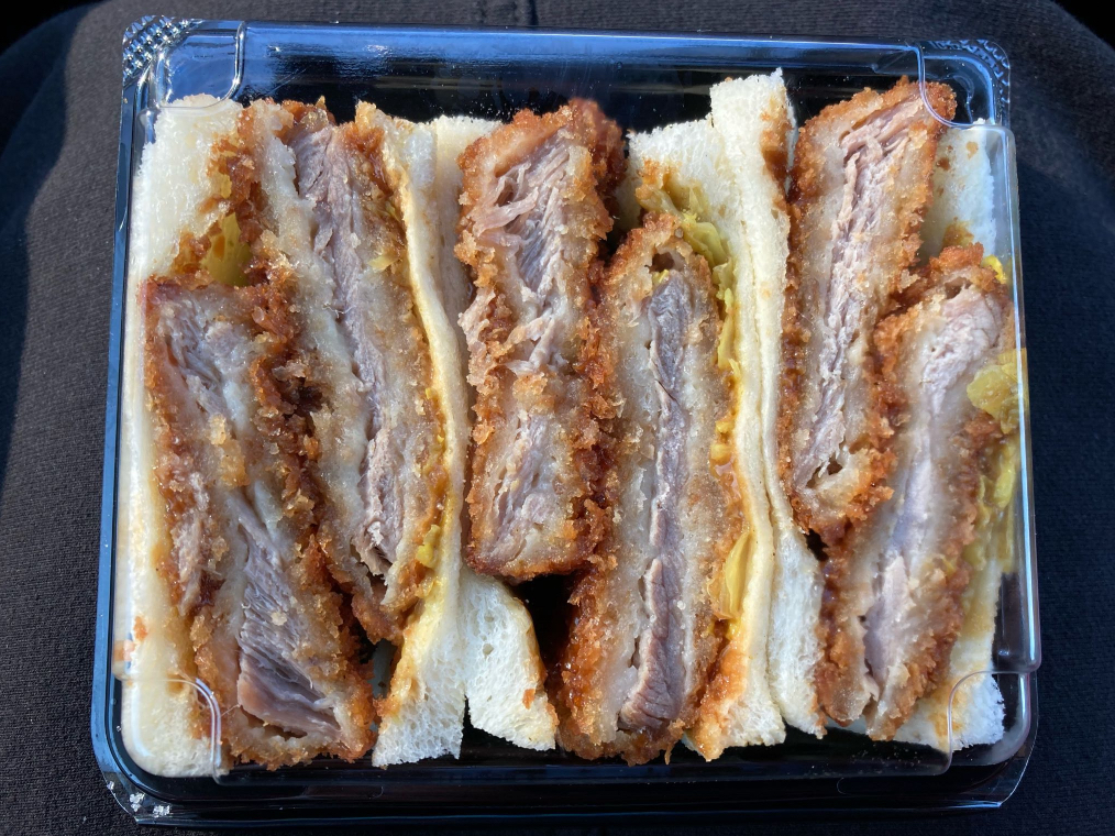 下記の写真は普通のヒレカツサンドですが、サイズ違いで食べ切りヒレカツサンド(1つのサンドイッチにヒレカツが1枚挟まったもの×2個)もあります。お一人で食べたい方に最適な量です!