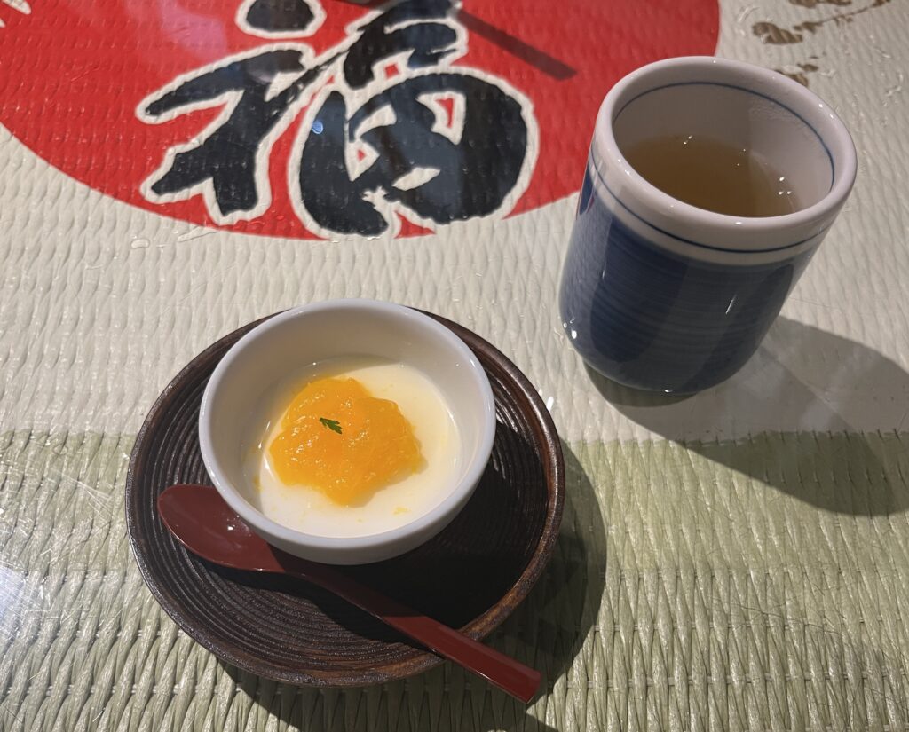 食後、みかんのパンナコッタとお茶を出して頂きました。