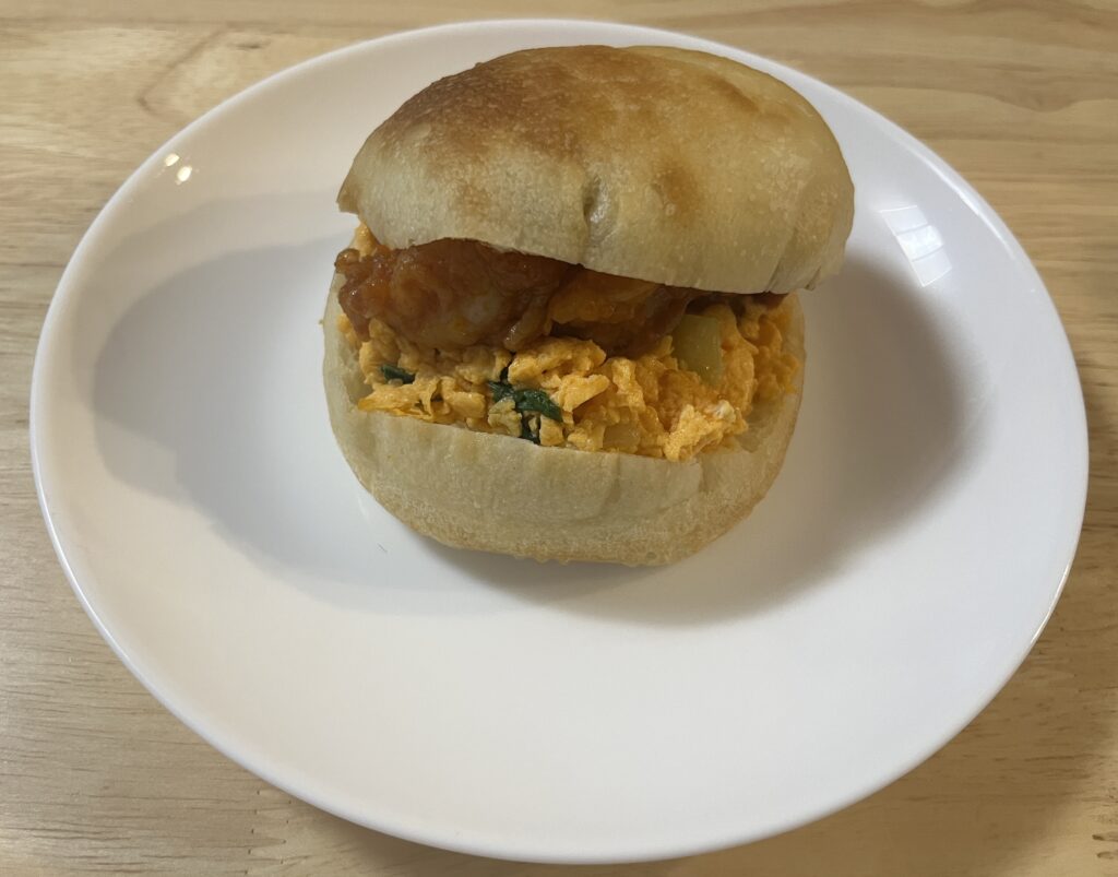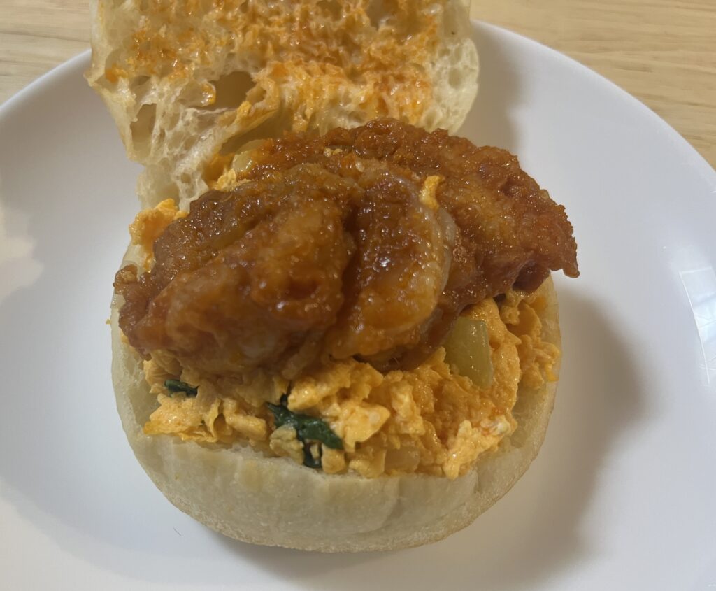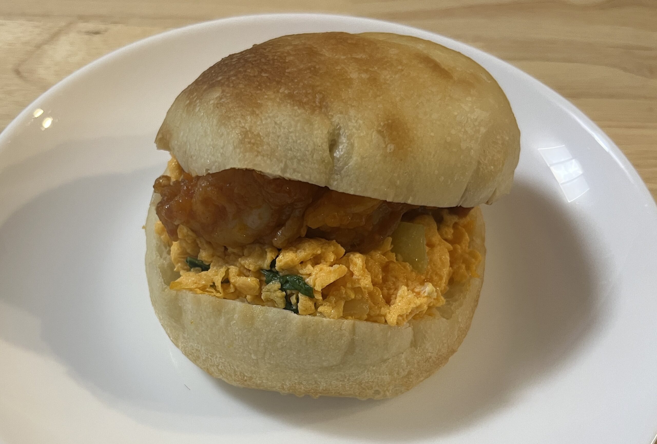 エビが3つも入っています。玉子が緩和してくれますが口の中が少しひりひりするので、辛い物が苦手な方はご注意ください!私はこのパンが大好きです!本当にすごく美味しいですよ!訪問したら絶対に買うパンです!