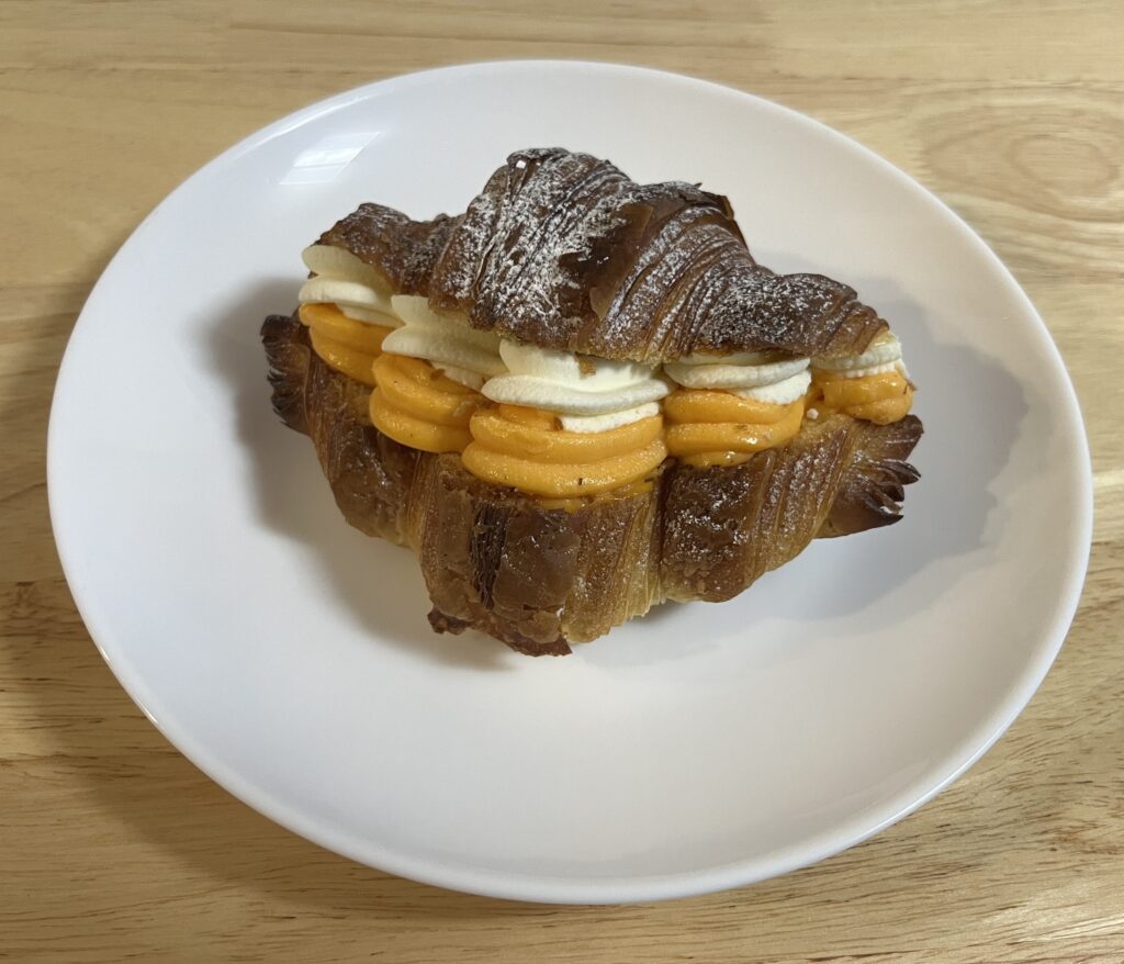 2種類のクリームが入っています。冷蔵商品なので普通のクロワッサン程ではありませんが、パンの外側はサクっとしています。パンはしっとりしつつ、少しもっちり感もありました。パン自体は甘くなくクリームとバランスが取れており、全体的に本当に美味しいです。